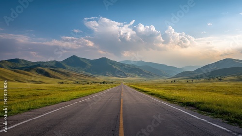 © khumthong, Fototapeta premium Scenic Asphalt Road Journey Through Rolling Green Hills and Mountains Under a Blue Sky