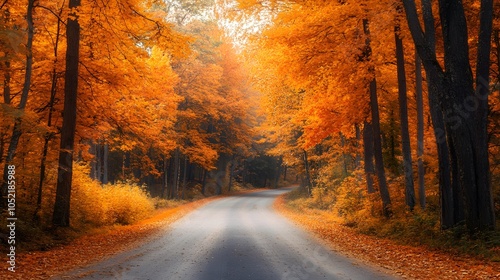 © Tonadech, Obraz premium Scenic autumn drive through a forest of bright orange trees