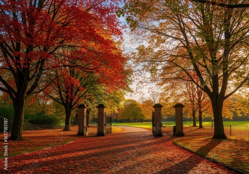 © Muhammad, Fototapeta premium Scenic autumn foliage path entrance with vibrant colors in tranquil park