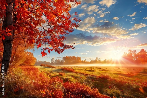 © nsit0108, Obraz premium Scenic autumn landscape at sunrise with colorful foliage, fog, and sunbeams creating a magical atmosphere