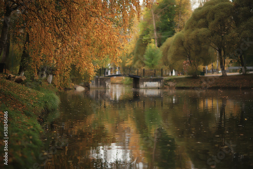 © kichigin19, Obraz premium scenic, autumn landscape trees and forest river and lake, nature view fall background