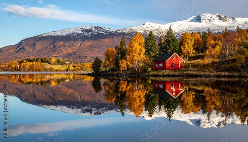 © Johanddss, Fototapeta premium Scenic autumn landscape with a red cabin reflected in a tranquil lake.