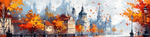 Naklejka premium Scenic autumn morning in an enchanting European town with vibrant fall foliage, historic architecture, and misty atmosphere