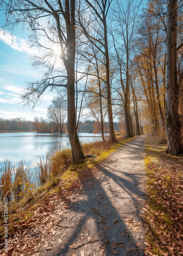 © pijav4uk, Fototapeta premium Scenic autumn park path with trees, Lake, and clear blue sky