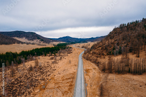 © Parilov, Obraz premium Scenic autumn road in Altai Siberia amid rolling hills and forested landscapes