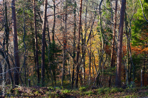Fototapeta premium Scenic autumn scene with trees and forest at region Uetliberg Albis, Canton Zürich, on a sunny and foggy autumn afternoon. Photo taken November 12th, 2021, Zurich, Switzerland.