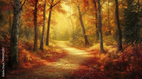 © imageX, Obraz premium Scenic Autumn Trail with Dappled Sunlight and Fallen Leaves