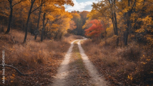 Obraz premium Scenic Autumn Walking Trail Surrounded By Vibrant Fall Foliage With Open...