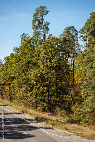 Fototapeta premium scenic autumnal forest with golden foliage and path in sunlight