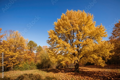 © AkuAku, Fototapeta premium Scenic backdrop of golden fall foliage with breezy trees and natural sunlight, ample empty area