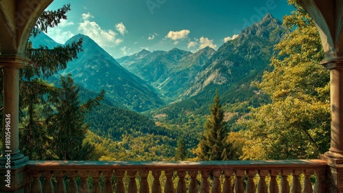 © Nayyab, Obraz premium Scenic balcony overlooking majestic mountain range on a sunny day with terrace and panoramic landscape view