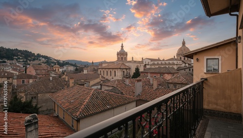 Obraz premium Scenic balcony view overlooking a charming town with an ancient church,...