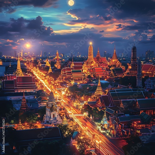 © MiltonKumar, Fototapeta premium Scenic bangkok skyline with golden pagodas and temples high resolution picture