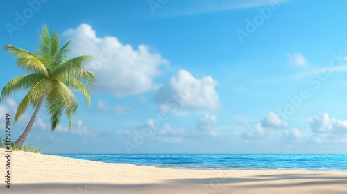 Fototapeta premium Scenic beach paradise, palm tree on sandy shore under blue sky tropical