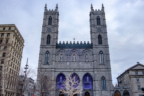 Fototapeta premium Scenic beautiful view of Cathedral of Basilica of Notre Dame of Montreal. Depressive winter look of old catholic cathedral in the largest megapolis city of Quebec in Canada