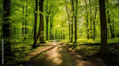 Naklejka premium Scenic beech forest path, young green leaves, sunlight filtering through trees