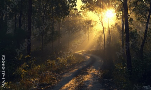 Naklejka premium Scenic bicycle trail winding through a dense forest at sunset, golden rays...
