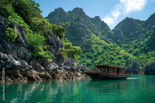© Pangestu, Fototapeta premium Scenic Boat Navigating Green Water in Mountainous Landscape with Rocky Cliffs and Dense Vegetation