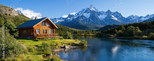 © Image4u, Fototapeta premium Scenic cabin by a lake with mountains in the background.