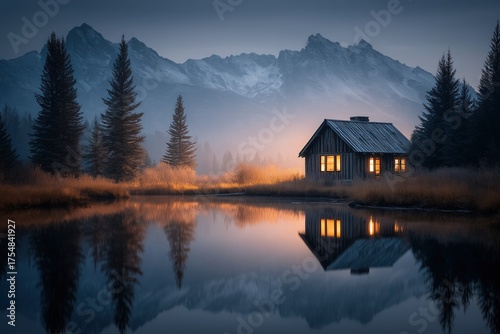 Fototapeta premium Scenic cabin by tranquil lake surrounded by mountains at dusk, offering a...