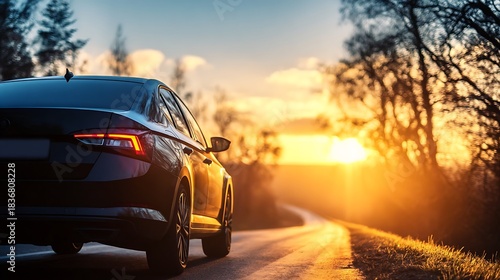Fototapeta premium Scenic car journey at sunset with rain streaks on window