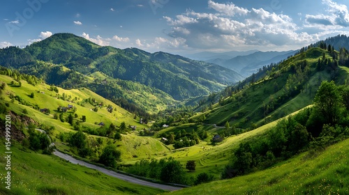 © Abul, Fototapeta premium Scenic Carpathian Mountains Valley View Green Hills, Small Houses, and Dramatic Sky