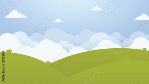 Fototapeta premium scenic cartoon background featuring a bright sky, fluffy clouds, and green hills, perfect for creative designs and nature-inspired projects.