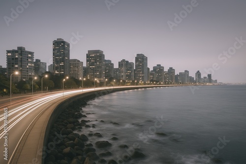 Obraz premium Scenic city skyline at dusk along a waterfront with a long curved road and...