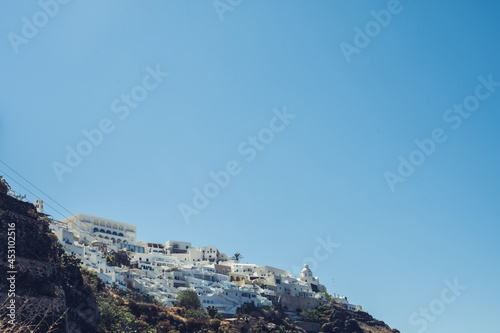 Naklejka premium Scenic cityscape of Thira. city on the hill. White architecture. Santorini...