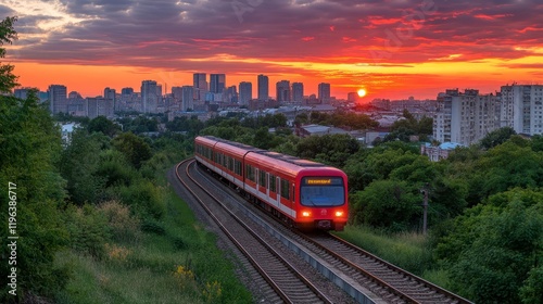 © A4719, Naklejka premium Scenic Cityscape Sunset Red Electric Train on Railway Tracks