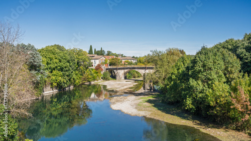 Fototapeta premium Scenic cityscape view of Vidourle river and the Pont Neuf or New Bridge in...