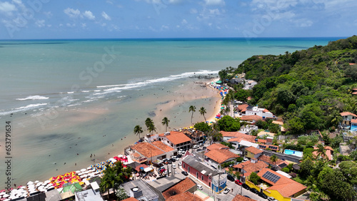 © bydronevideos, Naklejka premium Scenic cliffs at Pipa Beach in Rio Grande do Norte. Brazil Northeast. Vacations landscape. Paradise scenery. Pipa Beach at Rio Grande do Norte. Scenic cliffs on the beach. Brazil Northeast.