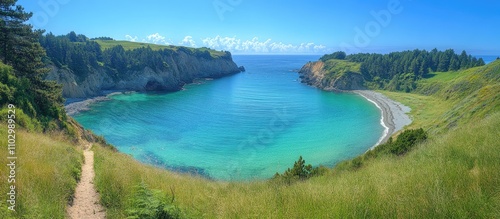 © GenZGraphics, Fototapeta premium Scenic coastal bay with turquoise water surrounded by lush greenery and a winding trail leading to the beach and canyon view.