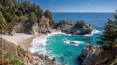 Fototapeta premium Scenic coastal inlet features a secluded beach fed by a small waterfall under...