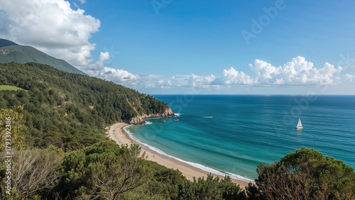 Fototapeta premium Scenic coastal landscape with beach, forested hills, and blue ocean under...