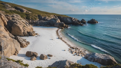 © NeuralNiche, Fototapeta premium Scenic Coastal Landscape with Rocky Shoreline and White Sand Beach Under Clear Blue Sky