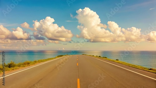 Fototapeta premium Scenic coastal road stretches towards azure ocean under bright sky with fluffy clouds