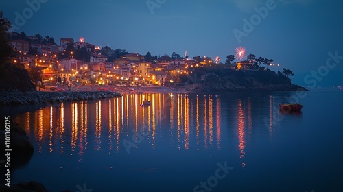 Fototapeta premium Scenic Coastal Town Illuminated by Fireworks and Decorative Lights for New Year's Celebrations