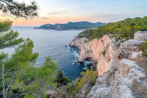 © Muhammad, Fototapeta premium Scenic coastal view at sunset with cliffs, greenery, and distant mountains near the sea