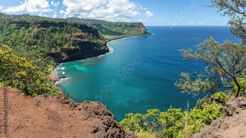 Obraz premium Scenic coastal view showcasing lush cliffs, turquoise waters, and a clear sky...