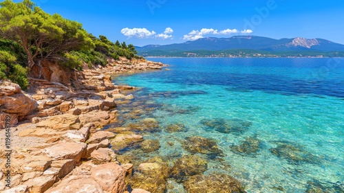 Fototapeta premium Scenic coastal view with clear turquoise waters and rocky shoreline.