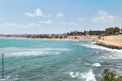 © Alex Tihonov, Fototapeta premium Scenic coastline of Punta Prima, turquoise waters of Mediterranean Sea, rocky cliffs along shoreline. Costa Blanca, Province of Alicante, Spain