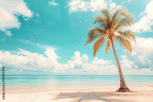 Obraz premium Scenic coral beach with palm tree sky outdoors tropical.