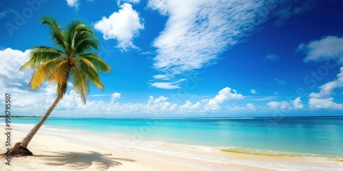 Fototapeta premium Scenic coral beach with palm tree summer sky landscape.