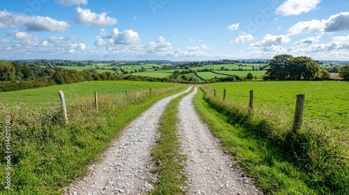 Fototapeta premium Scenic country lane leading to rolling green hills under a blue sky with...