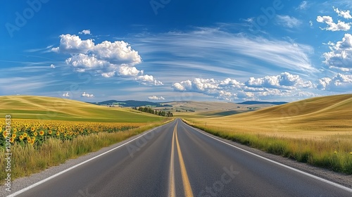 © kaiserseeing, Fototapeta premium Scenic Country Road Through Golden Fields and Sky