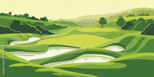 Obraz premium Scenic Countryside Golf Course Landscape with Flags, Greens, and Sand Bunke. Vector illustration
