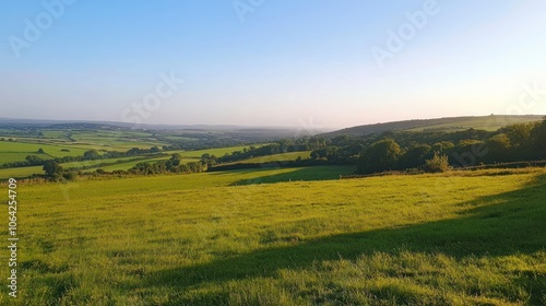 © Tasnim, Fototapeta premium Scenic countryside landscape with green fields under a clear blue sky.
