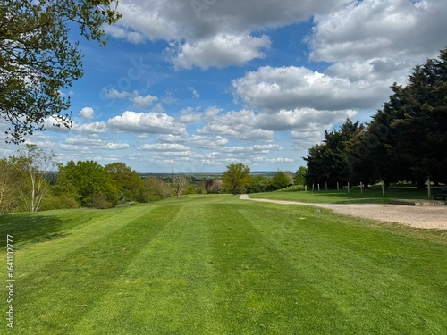 © Darren, Obraz premium Scenic Countryside Landscape with Lush Green Grass and Fluffy Clouded Sky
