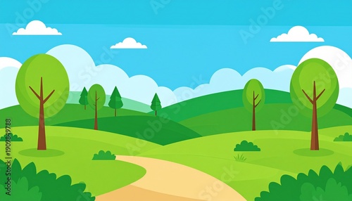 © Kaki, Fototapeta premium Scenic countryside landscape with winding path green trees blue sky summer nature illustration
